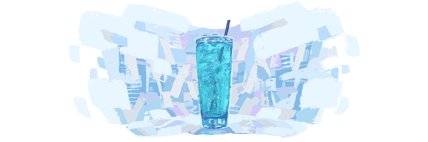 A drink for when you need to believe in forever. Blue curacao that shimmers like their eyes in the twilight. Sip this one gently, to the sound of lackadaisical synth and the crackle of dreamy static. Tonight, you have all the time in the world. A sizzling guitar cracks open the steamy evening. A cooling drink is in order.