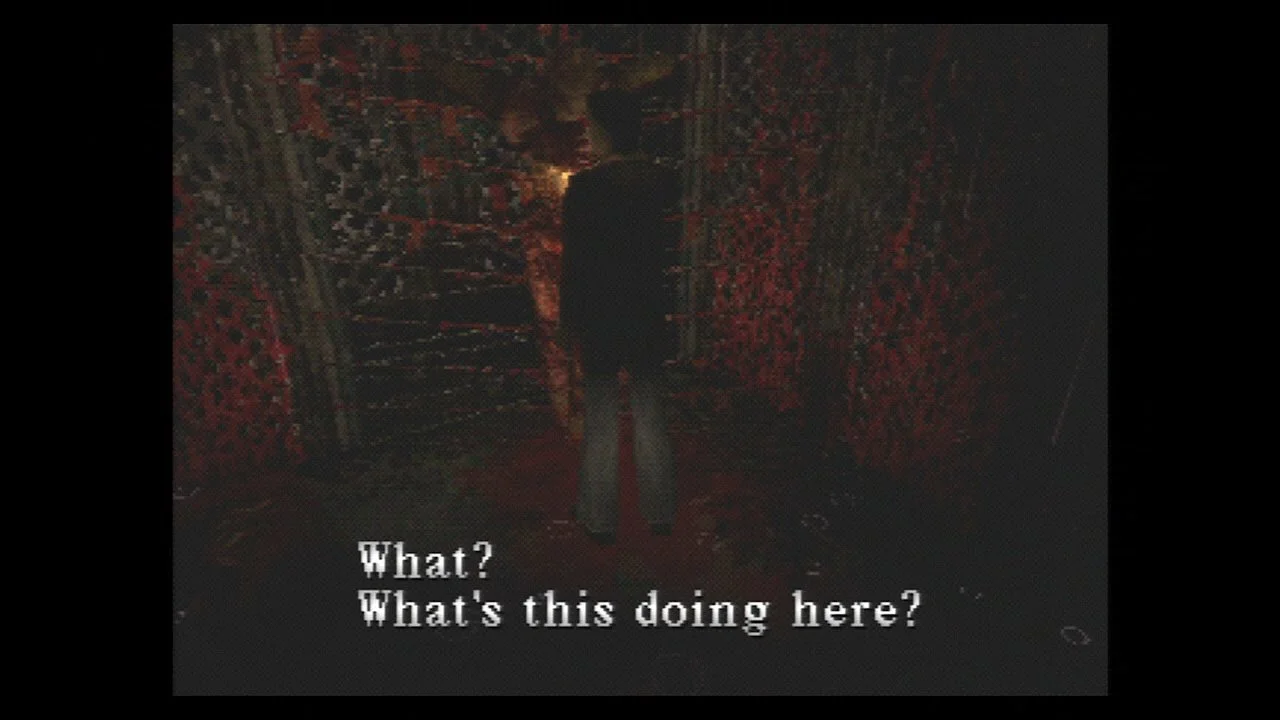 Games like Rule of Rose take many cues from the Silent Hill series, which functionally laid out a blueprint for how to do 3D psychological horror that we're still referencing. Like Rule of Rose, we can learn a lot from how Silent Hill conceptualizes nightmare aesthetics, and how that's made apparent through its level design. The first Silent Hill (Team Silent, 1999) starts with a nightmare, which serves as foreshadowing for some of the awful things to come. Player character Harry is navigating a hallway that grows increasingly dark until he finally pulls his flashlight out, mildly illuminating his surroundings. The walls are rusted and brown-red, made of grating and wrought iron. Harry comes across a body crucified to an I-beam, and as the camera tilts up, voltage runs through the corpse as it begins to violently convulse. When the player regains control of Harry, several small creatures with knives emerge from the darkness and stab him to death, jolting him awake.